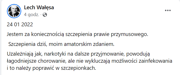 Niestety izolacja nie dotyczy Facebooka, gdzie Wałęsa publikuje swoje mądrości. W poniedziałek (24.01.2022) były prezydent wypowiedział się na temat szczepionek kowidowych. Najpierw stwierdził, że jest za „koniecznością szczepienia prawie przymusowego”. Potem oświadczył, że szczepionki uzależniają jak narkotyk „na dalsze przyjmowanie”. I tu akurat trudno się nie zgodzić. Ale jeśli szczepionki są jak narkotyki, to koncepcja „prawie przymusowego” szczepienia brzmi jak nakłanianie do narkomanii. A to raczej nie jest działanie prozdrowotne.
