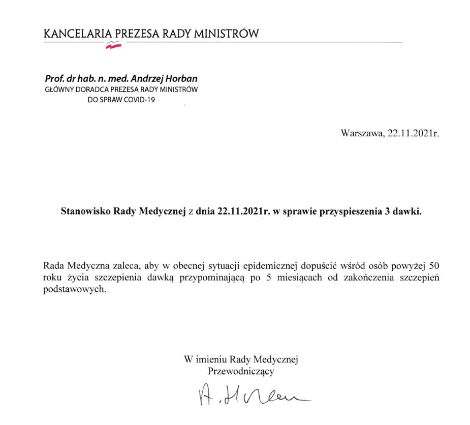 W poniedziałek (22.11.2021) Rada Medyczna przy premierze wydała rekomendację, aby przyspieszyć podawanie trzeciej dawki szczepionki przeciw Covid-19. Obecnie jest to możliwe po upływie sześciu miesięcy od podania drugiej dawki. Rada zaleca, żeby skrócić ten termin do pięciu miesięcy.