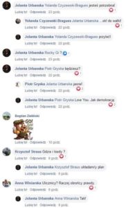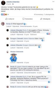 Ulicznicy: do boju! Ta pisowska galareta boi się nas! Aktualizacja: ludzie, jak długo mamy słuchać bredni (kłamliwych) polityków. Do dzieła – kilka dni temu na swojej stronie na Facebook’u napisała Urbańska. Pod wpisem wdała się w dyskusję ze swoimi zwolennikami, których wzywa do pójścia z nią na barykady: Zło wygrało w Polsce. Wchodzę na barykady – pisze radna PO. Na pytanie rozmówcy: Gdzie i kiedy? odpowiada: dam cynk.