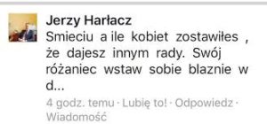 Ty śmieciu pisowski. Pajacu je… Śmieciu, a ile kobiet zostawiłeś, że dajesz innym rady. Swój różaniec zostaw sobie błaźnie w d… – napisał radny odnosząc się również do wypowiedzi Pazury z TVP Info, gdzie zaznaczył, że nie po drodze mu z czarnymi protestami.