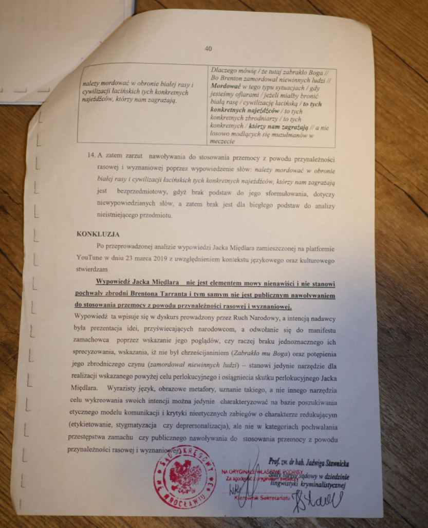 Prof. Jadwiga Stawnicka, biegły sądowy w dziedzinie lingwistyki kryminalistycznej, powołana do oceny wideo-felietonu Jacka Międlara o manifeście zamachowca z Christchurch, wydała 14 września 2020 roku opinię, której konkluzja brzmi: „Wypowiedź Jacka Międlara nie jest elementem mowy nienawiści i nie stanowi pochwały zbrodni Brentona Tarranta i tym samym nie jest publicznym nawoływaniem do stosowania przemocy z powodu przynależności rasowej i wyznaniowej”.