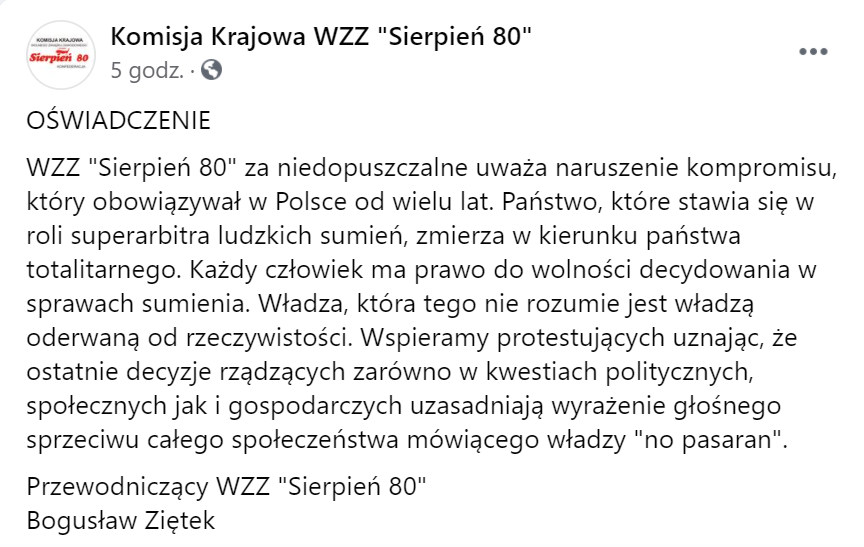 W poniedziałek (26.10.2020) Komisja Krajowa WZZ „Sierpień 80” poinformowała, że „związkowcy wspierają protestujące kobiety”. Przewodniczący Bogusław Ziętek wydał oświadczenie, w którym nawołuje do sprzeciwu całego społeczeństwa mówiącego władzy „no pasaran”.