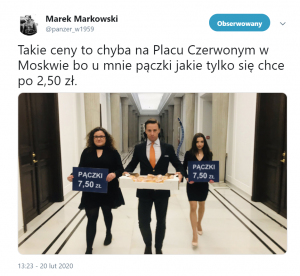 A teraz wisienka na torcie, czyli dziennikarz TVP Info, Radosław Poszwiński, podający dalej fejk wyprodukowany przez „prawych i sprawiedliwych”. I do tego taki komentarz: „Ja kupowałem pączka za 2,50. Czy jeśli ktoś nie potrafi kupić tanio, tylko kupuje 3x drożej niż na rynku, a później się żali z tego powodu, może być dobrym prezydentem?”.