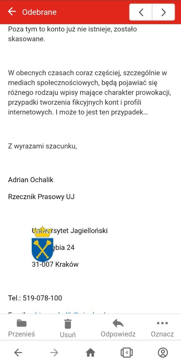 W sprawie skandalicznego wpisu interweniowali nasi Czytelnicy. Jeden z nich otrzymał odpowiedź od rzecznika prasowego UJ. Rzecznik potwierdził, że na uczelni studiuje Ukrainka o imieniu i nazwisku widniejącym przy wpisie, ale ta nie przyznaje się do jego autorstwa. Poza tym konto już nie istnieje, zostało skasowane – dodaje rzecznik. I w zasadzie to wystarczyło, żeby władze uczelni zamknęły procedury wyjaśniające i nie pociągnęły Ukrainki do odpowiedzialności.