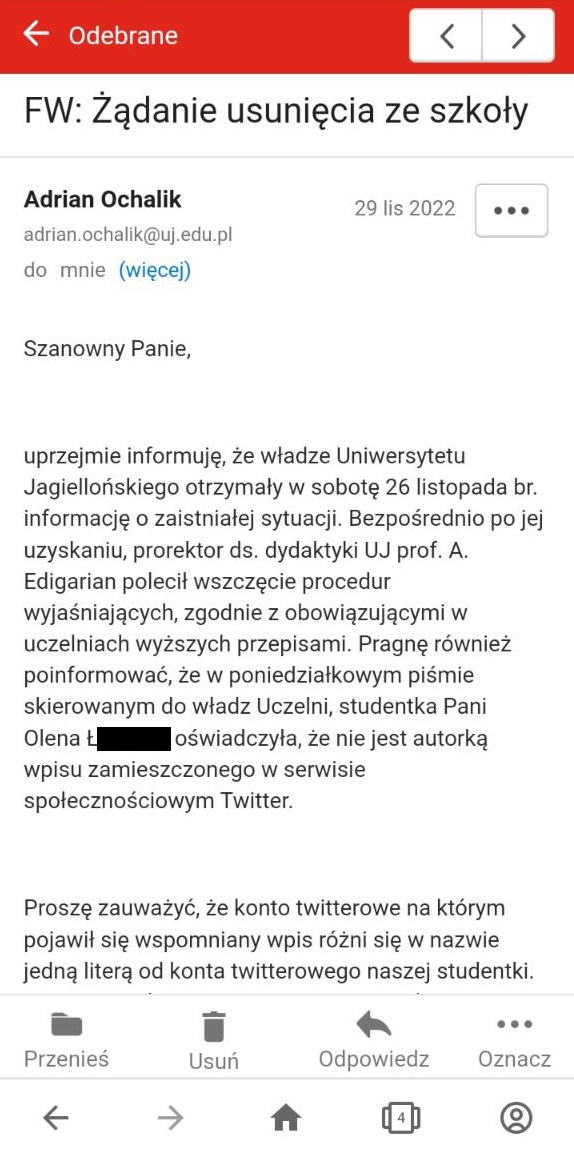 uprzejmie informuję, że władze Uniwersytetu Jagiellońskiego otrzymały w sobotę 26 listopada br. informację o zaistniałej sytuacji. Bezpośrednio po jej uzyskaniu, prorektor ds. dydaktyki UJ prof. A. Edigarian polecił wszczęcie procedur wyjaśniających, zgodnie z obowiązującymi w uczelniach wyższych przepisami. Pragnę również poinformować, że w poniedziałkowym piśmie skierowanym do władz Uczelni, studentka Pani Olena Ł., oświadczyła, że nie jest autorką wpisu zamieszczonego w serwisie społecznościowym Twitter.