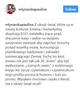 „Z okazji świąt, które są w naszej kulturze totalną i bezwstydną eksplozją EGO: światełka żrące prąd, dręczenie karpi i siebie na wzajem, zarzynanie zwierząt aby napchać brzuchy ponad wszelką miarę, konsumpcja plastikowego badziewia ( zabawki) zaśmiecającego Ziemię, fochy bo ktoś znowu nie jest taki jak JA „kcem” aby był, wykluczanie „czarnych owiec” z rodzinnego kręgu itd. życzę czytelnikom i czytelniczkom tego profilu poczucia humoru i luzu po prostu. Wysyłam mnóstwo ciepła z Kerali, nie z okazji świąt wcali!”