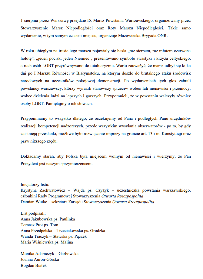 W liście zaatakowano Młodzież Wszechpolską, ONR i Stowarzyszenie Marsz Niepodległości sugerując jakoby były to organizacje odwołujące się do nazizmu i faszyzmu oraz szerzące nienawiść rasową i narodowościową. Jako przykład nienawiści podano hasła „Raz sierpem, raz młotem, czerwona hołotę” oraz „Jeden pocisk, jeden Niemiec”. Stwierdzono, że w Powstaniu Warszawskim „walczyły też osoby LGBT”, a w Białymstoku „doszło do brutalnego ataku środowisk narodowych na uczestników pokojowej demonstracji”.
