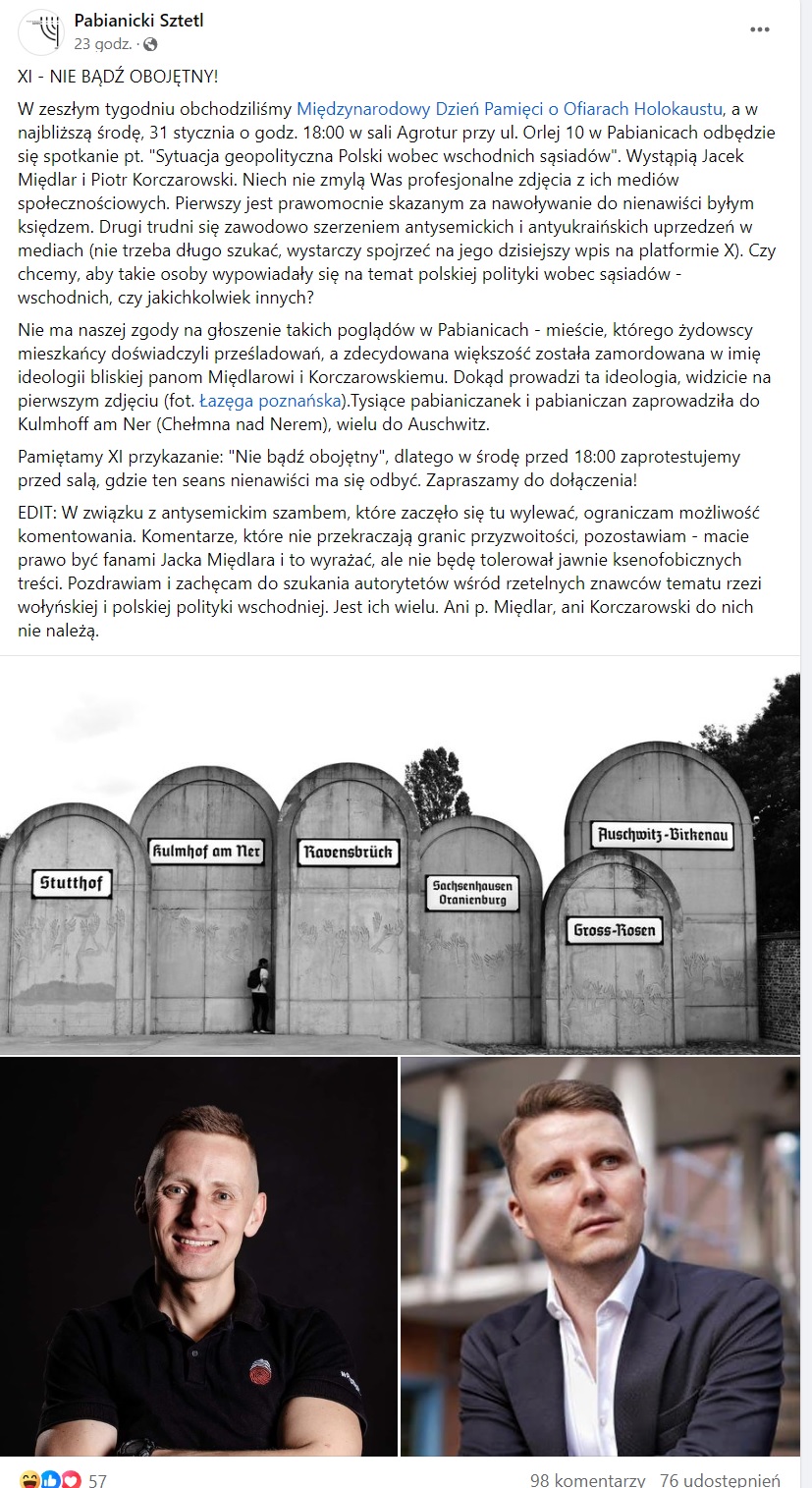 W najbliższą środę (31.01.2024 r.) w Pabianicach (woj. łódzkie) odbędzie się konferencja pt. „Sytuacja geopolityczna Polski wobec wschodnich sąsiadów”, podczas której prelekcje wygłoszą redaktorzy: Jacek Międlar (red. naczelny wPrawo.pl i autor książek) oraz Piotr Korczarowski (red. naczelny eMisjiTv). Z tym faktem nie mogą pogodzić się lokalni Żydzi.