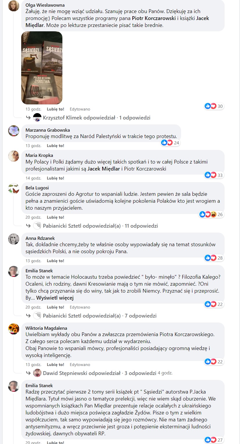 – Radzę przeczytać pierwsze 2 tomy serii książek pt ” Sąsiedzi” autorstwa P.Jacka Międlara. Tytuł mówi jasno o tematyce prelekcji, więc nie wiem skąd oburzenie. We wspomnianych książkach Pan Międlar prezentuje relacje ocalałych z ukraińskiego ludobójstwa i dużo miejsca poświęca zagładzie Żydów. Pisze o tym z wielkim współczuciem, tak samo wypowiadają się jego rozmówcy. Nie ma tam żadnego antysemityzmu, a wręcz przeciwnie jest groza i potępienie eksterminacji ludności żydowskiej, dawnych obywateli RP – internautka punktuje hipokryzję „Pabianickiego Sztetla”.